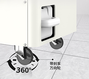 機(jī)器采用了帶有剎車的萬(wàn)向輪設(shè)計(jì),方便移動(dòng)到任意空間角落進(jìn)行使用。